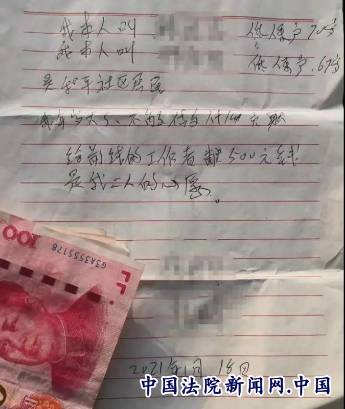 据当时参与防疫值守的法院干警回忆说:我当时在左岸华苑14号楼参与防疫卡点值守,一对上了年纪的夫妇在单元门口扔出一个信封,说一句“给你们的”,转身回到楼上。我赶忙过去了解情况,但二人早已不见踪影。捡起信封,里面有一封感谢信和折叠的整整齐齐的五百元现金。信上写道“我年岁大了,不能做什么贡献,给前线的工作者捐献500元钱,这是二人的心愿”。
